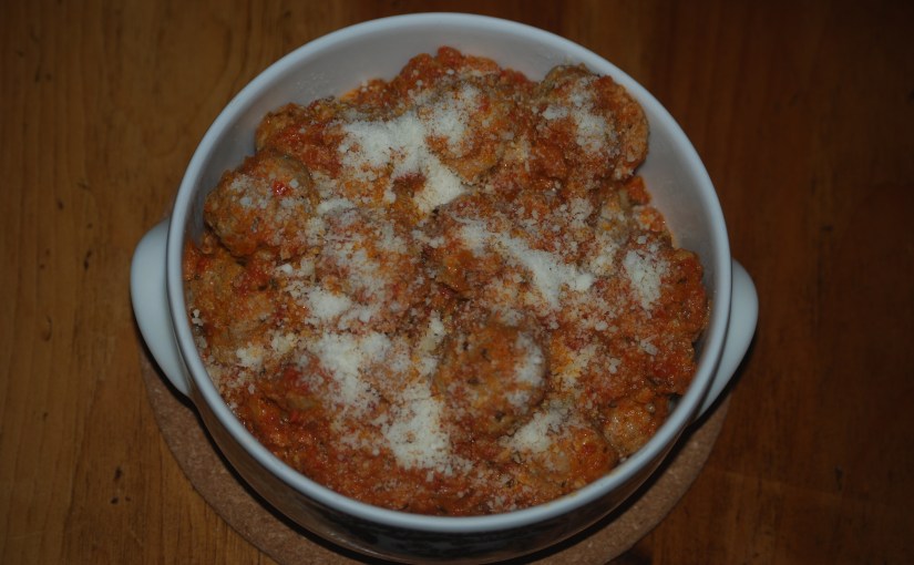 Combine all the ingredients for the meatballs (except the Parmesan) in a large bowl and gently mix them together. Roll into about 50 small meatballs. Drop these into the sauce and let them simmer for 30 minutes, or until cooked through. Sprinkle with Parmesan and serve over pasta or rice.