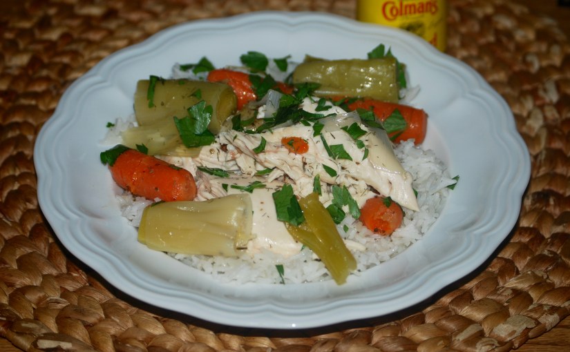Serve the chicken and accompanying vegetables in large bowls over brown basmati rice. Spoon the sauce in and add fresh parsley or dill on top. Serve with English mustard.