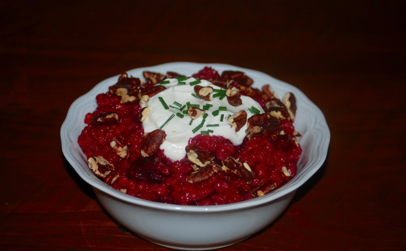 Meanwhile, puree half of the beetroot with half of the sour cream. Stir into the cooked barley along with the remaining cubed beetroot and warm through.
