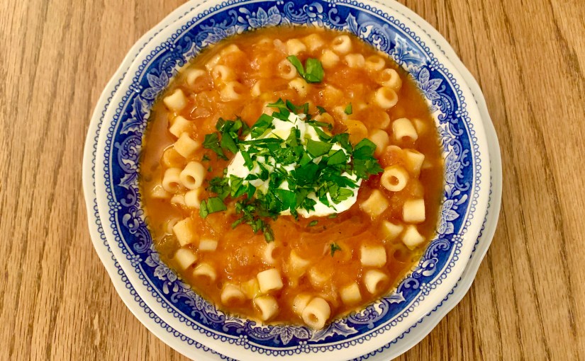 Puree with a stick blender, then tip in the pasta. Simmer until the pasta is tender. Ladle into bowl and serve with sour cream and parsley on top.