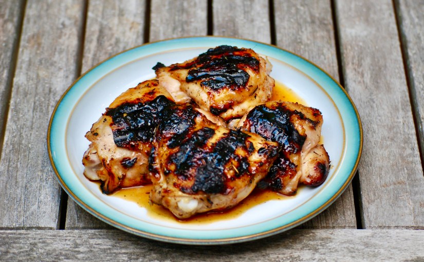 Heat the oven to 325°F and tip the chicken into a roasting tin with the marinade, skin side up. Cover with foil and roast for 2 hours. Remove the foil and turn the heat up to 425°F. Cook for another 15 minutes to brown the skin. (Alternatively, grill over a medium heat for 7-8 minutes per side, or until cooked through.)